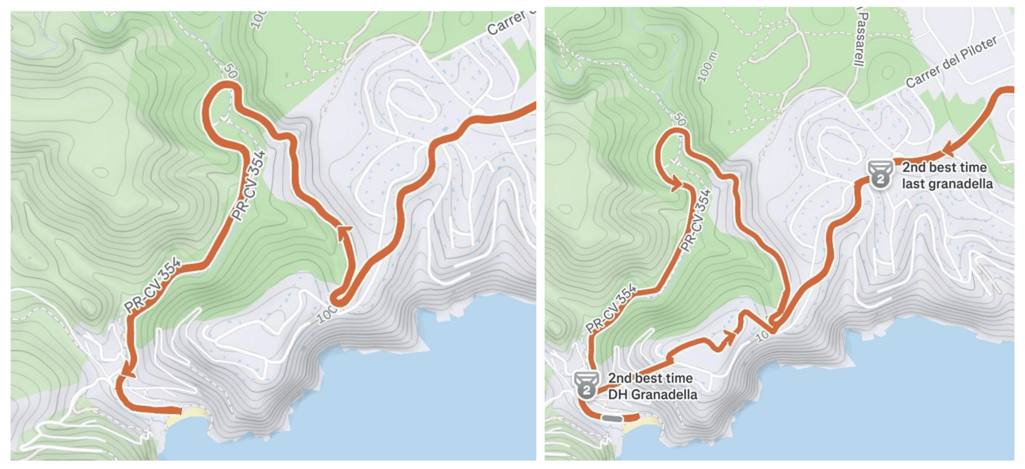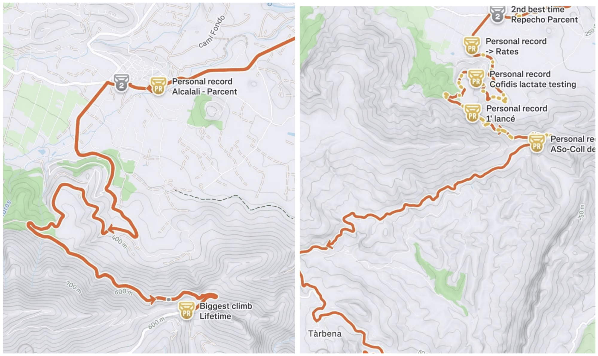 z lewej: podjazd i zjazd od Parcent; z prawej: podjazd od Percent i zjazd do miasta TarbenaProtip: Przy takich zjazdach ważna jest odpowiednia odzież - polecam kamizelkę, kurtkę przeciwwiatrową, rękawiczki, nogawki oraz chustę wielofunkcyjną! Nawet w słoneczne dni możecie się bardzo wychłodzić, pokonując zjazd z dużą prędkością.