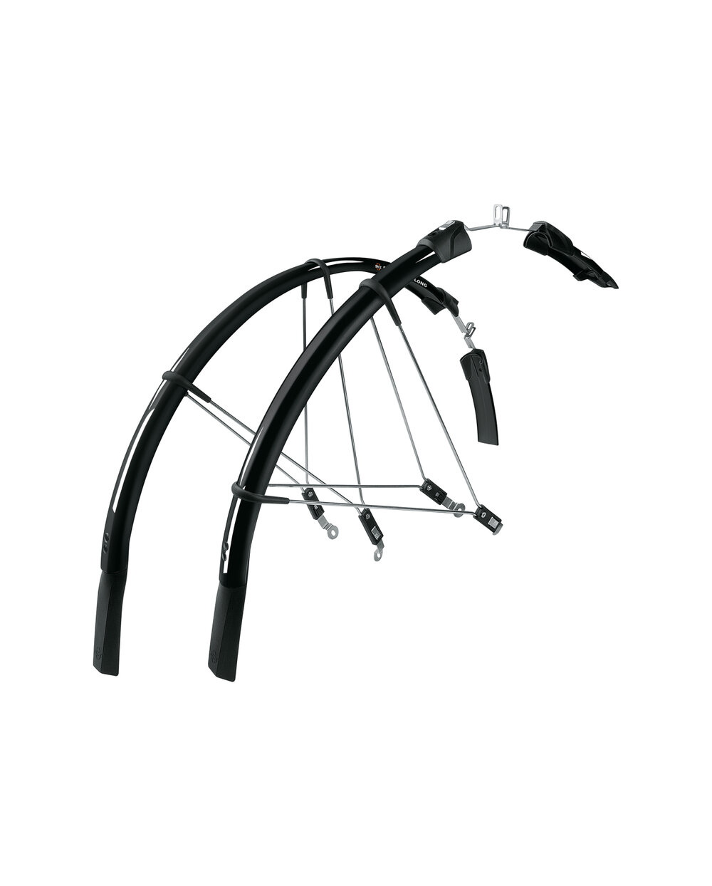 SKS Raceblade Long to wyjątkowo długie błotniki do rowerów szosowych, idealne na deszczową pogodę lub zimowe treningi. Koniec każdego błotnika wystaje poniżej piasty. Ta długość gwarantuje pełną osłonę, co oznacza, że Ty i rowerzysta jadący za Tobą jesteście chronieni przed rozpryskami wody. Można je idealnie dopasować do promienia koła poprzez regulację długości wsporników. Po przymocowaniu metalowych wsporników montażowych do roweru błotniki można założyć lub zdjąć w ciągu kilku sekund, co idealnie sprawdza się w razie potrzeby. Wsporniki mocuje się do śrub hamulcowych i do szybkozamykacza. Do opon o rozmiarze 700x20-25C Materiał: tworzywo sztuczne Długość przedniego błotnika: 525 + 150 mm Długość tylnego błotnika: 805 + 150 mm