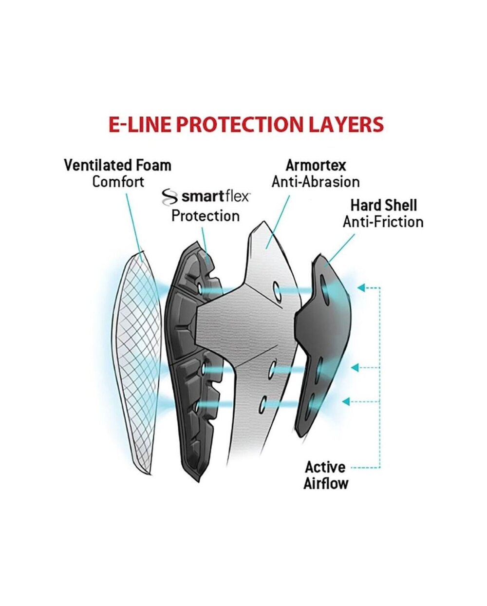 Ochraniacze łokci E-Line zostały zaprojektowane z myślą o najbardziej wymagających przejażdżkach. Ochraniacz wyposażony jest w trwałe elementy, dzięki którym jeździec może sobie pozwolić na więcej, a także lepiej go chronić w razie upadku. Ochraniacz pokryty jest twardą skorupą, która lepiej wytrzymuje bezpośredni kontakt z podłożem podczas upadku, nie uszkadzając przy tym całego ochraniacza. Pod nią znajduje się kolejna warstwa ochronna – tkanina Armortex odporna na rozdarcia i przetarcia. Najważniejszą warstwą jest Smartflex – aktywna pianka G-Form, która usztywnia się pod wpływem uderzenia i lepiej rozprowadza nacisk na większej powierzchni, chroniąc w ten sposób rowerzystę przed kontuzjami. Ostatnia, wewnętrzna warstwa to miękka wyściółka z pianki zapewniająca wygodę noszenia i pewniejsze dopasowanie ochraniacza. Regulowany dolny pasek zapinany na rzep stabilizuje cały rękaw. Wentylację zapewnia siateczka zastosowana w tylnej części rękawa oraz kanały wentylacyjne we wszystkich warstwach ochraniacza.