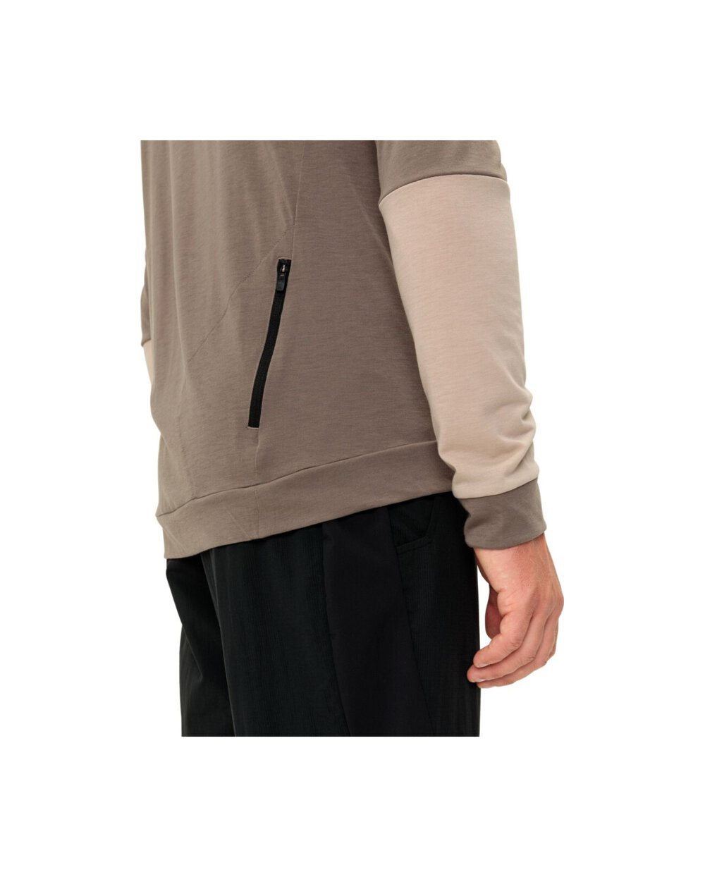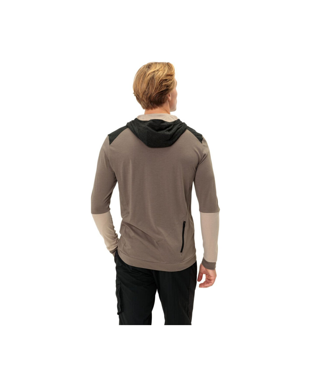 - Mała kieszeń tylna zapinana na zamek, kaptur, kontrastowe płaskie szwy, blok kolorów