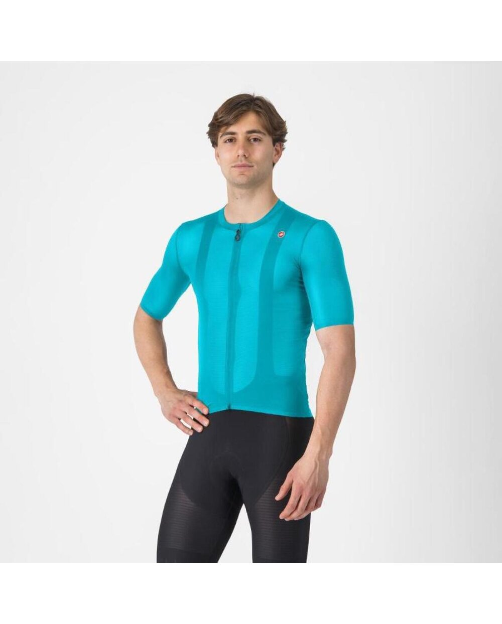 Przy tworzeniu koszulki Superleggera A/C naszym celem było uczynienie jej tak lekką i oddychającą, jak to tylko możliwe, ale bez poświęcania ochrony przed słońcem i zachowania praktycznych funkcji, takich jak zapinana na zamek kieszeń na klucze. Materiał nazwaliśmy Oltre, co można luźno przetłumaczyć jako „z tyłu” i ta koszulka naprawdę wykracza „poza” granice właściwości zwykłej koszulki – poziome prążki nadają materiałowi świetną oddychalność i elastyczność, a jednocześnie zapewniają wsparcie dla kieszeni. Ta koszulka jest nie tylko funkcjonalna, ale także dobrze wygląda. Aby uzyskać czysty krój, przykleiliśmy taśmą końce rękawów i talii. Tylne kieszenie idealnie dopasowują się do pleców i nie wystają. Te detale nadają koszulce czystą i wyrafinowaną estetykę.